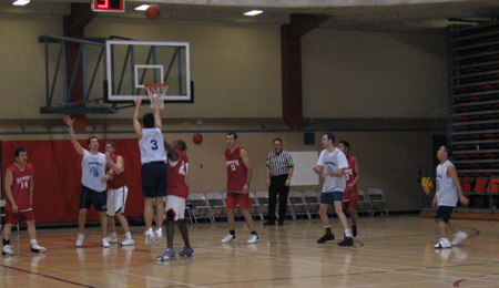 Neil appears momentarily disoriented while Dennis bolts for his spot at the 3 point line... |