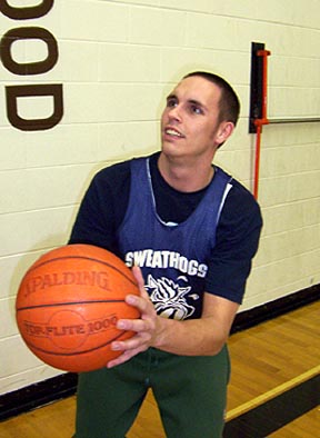 Ryan "Norwood" Kangas loves to mix it up with his opponents. He used to go by "Hollywood" before a recent relocation and new home purchase. He'll put you in "lock down" with his trash talk, even if you are the ref. Ryan talks the talk because he can walk the walk. Not afraid to shoot the rock, Ryan can be both an inside threat, an outside threat(and I mean OUTSIDE, as he has made some shots from the suburbs) and a threat to society. Norwood often leads the team in scoring, and always makes the scoresheet. Norwood likes to fire up the team for big games by covering his arms and legs in homemade tattoos, usually of the vulgar variety. He better be careful though, or he may be "black-balled." A huge fan of Ron Thompson, John Sauder and Sylvia Kuzik - Ryan often proclaims his forecast for rain throughout the game... "Let It Rain!!" Also known as "Seacrest", not because of his namesake, but because he "really digs Clay Aiken's tunes man!"