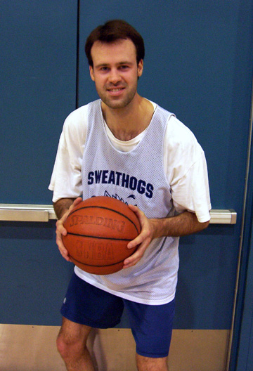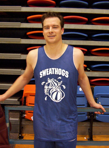 This self-proclaimed "Wizard" has been a Hog as long as anyone. Dog-dirty defence, clutching and grabbing, pushing and fouling. Jeff says, if he can get away with it, he'll do it. Nobody in basketball is more excited by their own defensive play than Jeff - he can often be seen applauding his own work (earning him the moniker "The Clap")on the court and has trouble containing his excitement.It seems to work for him, as the team often calls on "The Wiz" for a defensive stop. "The Clap" is as sure-handed as any Hog on the fast break and often makes the tough play look oh so easy. Constantly challenges for the lead in minutes played, as he rarely comes off the court. At one time he was known as "the Tank", or simply "225" when he was at his maximum game weight. He is now on European hiatus, scouring Europe's pubs for a mug of tasty brew, forever in search of his long-lost jump shot. The Wiz pledges to return to Peg City for the 2005-2006 season, fresh off of 2 years of schooling young children with his game on the courts of Lisbon.